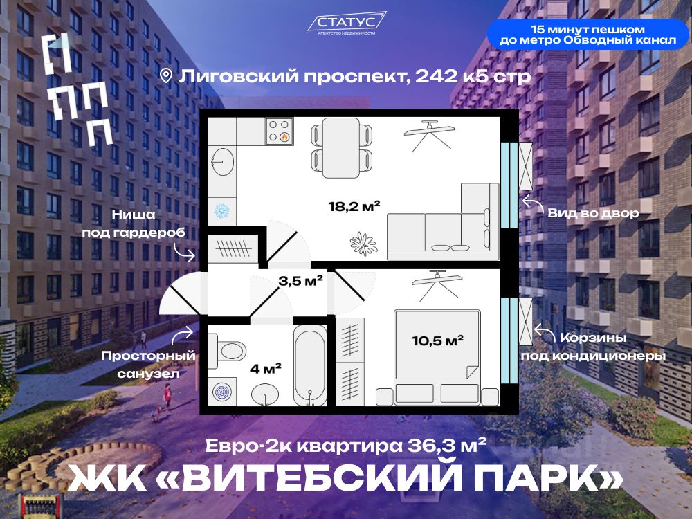 Располагается на комфортном для жизни 6 этаже. Все помещения - правильной формы, за счет того что вент шахты расположены за пределами квартиры. Удобно продумать свой дизайн проект. На входе специальная ниша, для небольшой гардеробной. Санузел 4м2, где без проблем помещается стиральная машина. Спальня 10,5 - кровать, шкаф и тумба с телевизором - что еще нужно в спальне? За счет этого все полезное пространство собрано в вашей будущей кухне-гостиной -18.2м2, где вы сможете собраться со своими друзьями и близкими. А если устанете от них - всегда можно уйти в спальню ) Окна в квартире увеличенного объема, с видом в облагороженный двор. Снаружи имеются корзины под кондиционер, не придется ломать голову куда деть наружный блок.