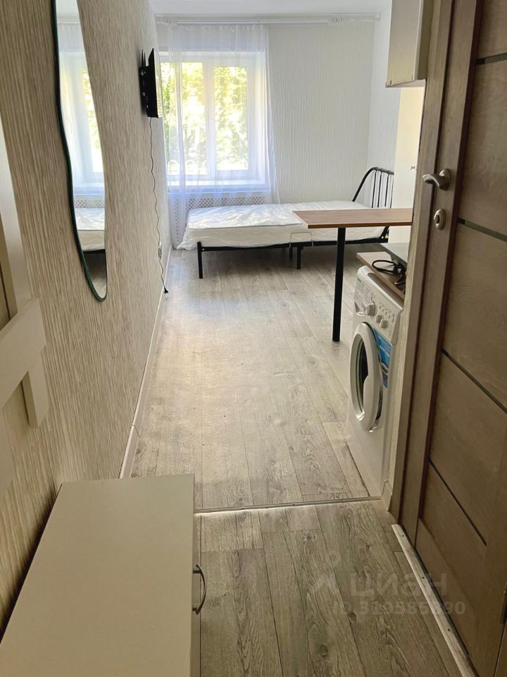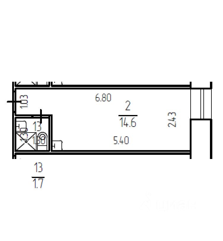 Студия площадью 16,3 кв.м, см. приложенный план. Окно со стеклопакетом смотрит в большой зеленый двор, солнечная сторона. В студии оборудован совмещенный санузел, место под кухню.