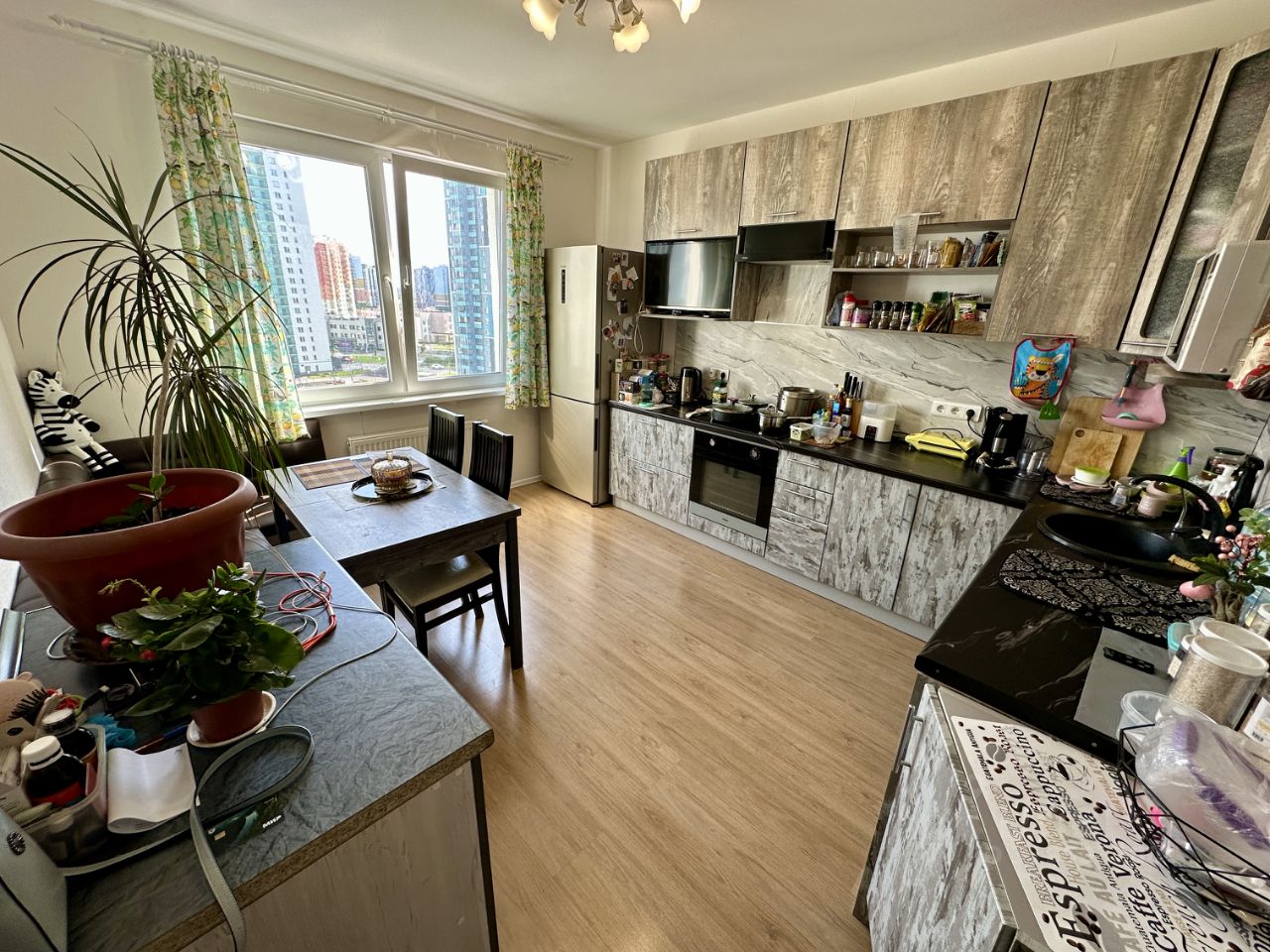 Монолитный дом 2020 года от хорошего застройщика ЛСР. ЖК комфорт класса "Новая Охта 2" с благоустроенными дворами, видеонаблюдением, гостевыми парковками. Рядом с домом строится ещё 1 детский сад. Квартира с продуманной планировкой: удобные ниши заняты шкафами, сделанными на заказ; большая квадратная кухня 13.8м, и 2 изолированные комнаты( 15.5м и 13.1м). Кухня делалась на заказ. Встроенная мебель и техника останутся новым владельцам.