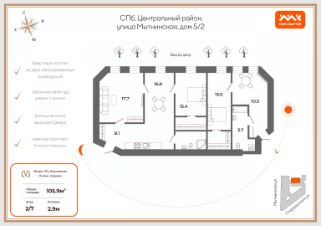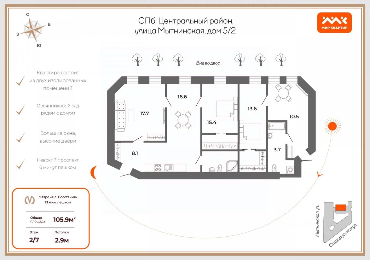 Первый вход - парадный с Мытнинской улицы, ведет в просторную двухкомнатную квартиру с изолированными комнатами, большой кухней-гостиной, гардеробной и душевой.