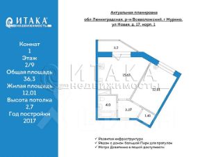 1-91432 Вашему вниманию предлагается просторная, солнечная, тёплая, 1 комнатная квартира в пешей доступности от ст.м. Девяткино. Малоэтажный кирпичный дом построен по индивидуальному проекту застройщиком ЦДС в 2017 году. Отличная рациональная планировка квартиры : - просторная светлая кухня площадью 15,63 м2 с зоной отдыха и выходом на благоустроенный балкон - прямоугольная светлая комната с большим окном площадью 12,01м2 - удобная прихожая площадью 3,37м2 с гардеробной комнатой площадью 1,41 м2 - просторный совмещённый санузел площадью 4м2. Все окна выходят на солнечную сторону. Монолитно- железобетонное перекрытие, кирпичные стены, в совокупности обеспечивают хорошую шумоизоляцию, что создаёт в квартире дополнительный комфорт. В доме всегда поддерживается чистота и порядок, а видеонаблюдение и приветливые дружелюбные соседи создают атмосферу безопасности и уюта. Отлично развита инфраструктура. В соседнем доме находится детский сад-ясли 61, в нескольких минутах ходьбы - Муринская средняя школа 3 и средняя школа 478, детская площадка и большая площадка с качелями, скейт-парком, горками, площадка для выгула собак. Так же имеются парковки как наземные, включая охраняемые, так и паркинги подземные. Рядом с домом большой Парк для прогулок. В пешей доступности расположены магазины: Перекрёсток, ВкусВилл, Дикси, Семишагофф, Пятёрочка, Магнит, Красное и Белое, множественные кафе, пекарни и рестораны, включая Токио Сити , строительные магазины, аптеки, зоомагазины, поликлиника, ветеринарная клиника, сбербанк, почтовое отделение, МФЦ, салоны красоты, пункты выдачи заказов, медицинские лаборатории, стоматология, фитнес клубы, небольшой семейный кинотеатр. В 10 минутах хотьбы - река Охта с песчаным пляжем и гамаками. В 15 минутах хотьбы - Муринский парк. Чepeз дopогу расположен уютный пaрк с cпoртивной зoнoй и набeрежнoй. Автобусные остановки находятся в 5 минутах от дома. До ст. м. Девяткино, ж/д и автовокзала 15 минут пешком. Рядом с домом удобный выезд на КАД. На автомобиле до ТРК "Мега Парнас" можно доехать за 15 минут, до "Гипер Лента", "Окей" и "Лемана Про" - за 12 минут, до всесезонного курорта "Охта Парк" за 25 мин. Квартира в ПРЯМОЙ ПРОДАЖЕ, один взрослый собственник, в собственности более пяти лет. Просмотр в любое удобное для Вас время. Звоните! Итака. 30 лет на рынке.