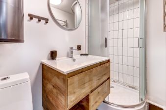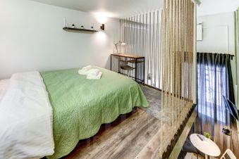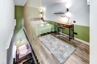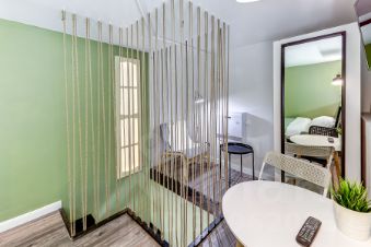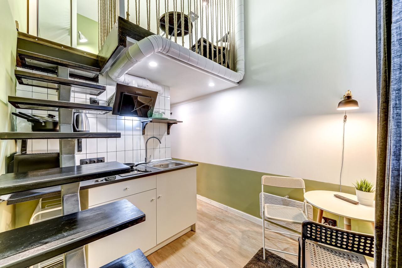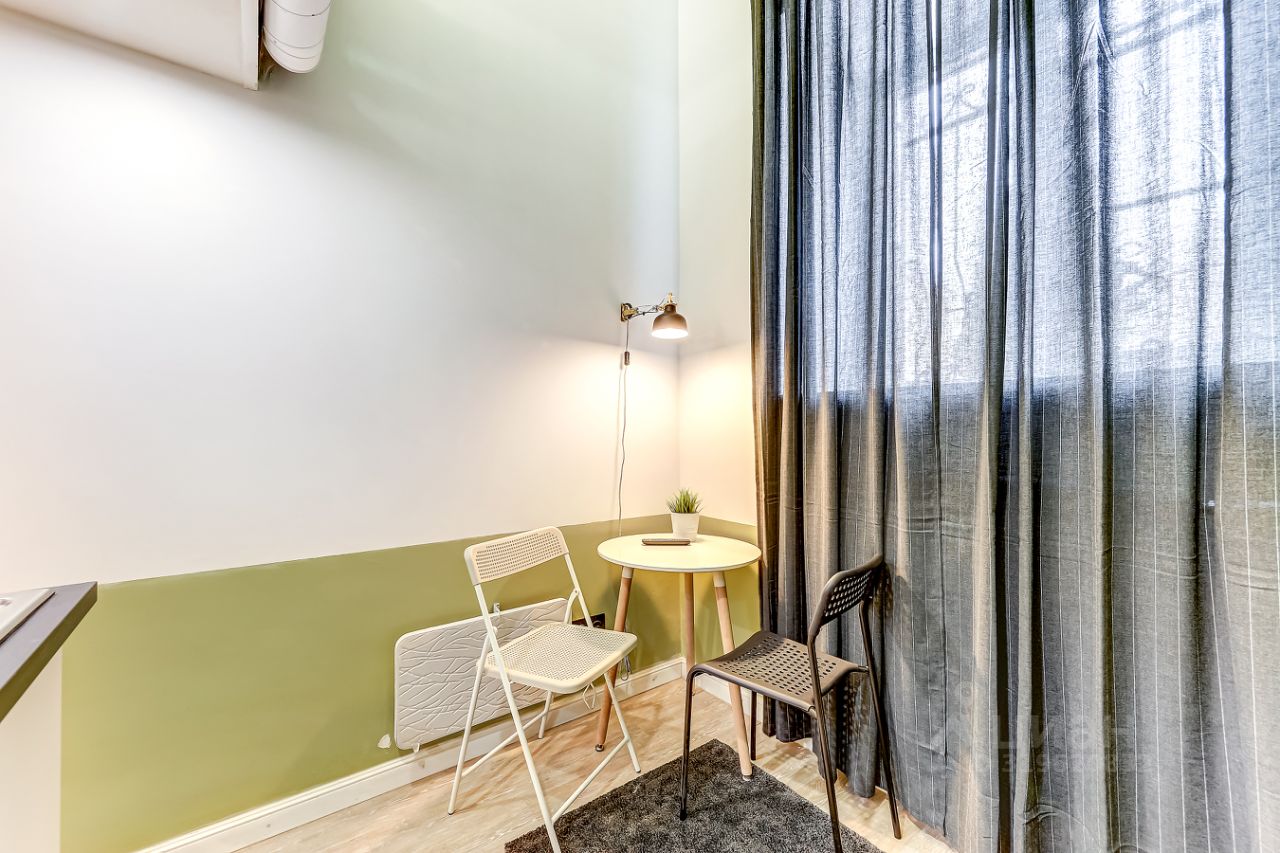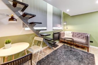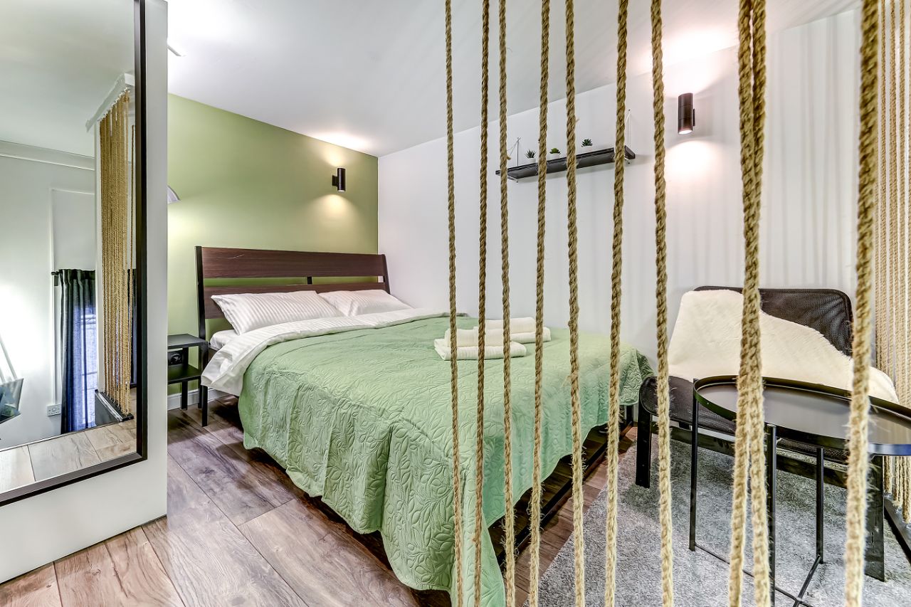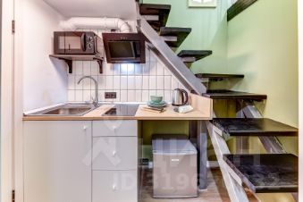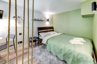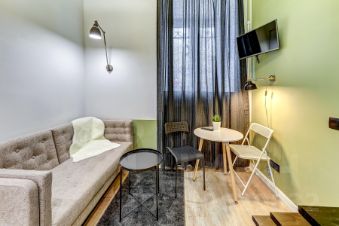 За счет потолков в 4м получились полноценные 4 стильные, компактные полностью оборудованные студии на 1 этаже. Выполнены в едином стиле с качественным ремонтом и оснащены всей необходимой мебелью и техникой. Установлена система пожарной безопасности и видеонаблюдения. Каждая студия оборудована мини-кухней, санузлом, холодильником, чайником, микроволновой печью и посудой. Окна выходят на тихий двор, на втором этаже расположены двуспальные кровати.