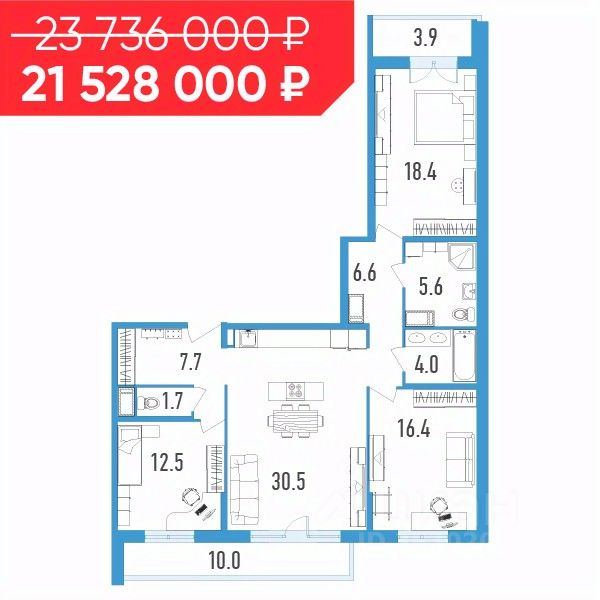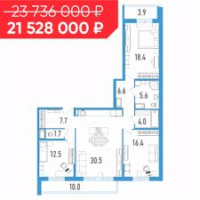 Продаётся 3-комнатная квартира в сданном доме (Александра Грина, 2к2), срок сдачи: II-кв. 2023, общей площадью 110.4 кв.м., на 11 этаже.