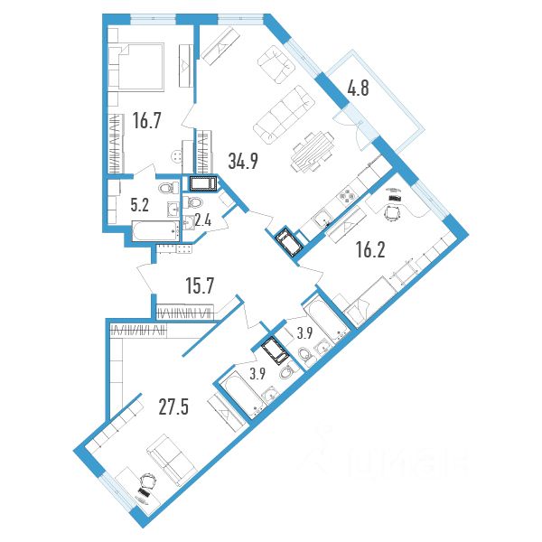 Продаётся 3-комнатная квартира в сданном доме (Александра Грина, 2к2), срок сдачи: II-кв. 2023, общей площадью 127.8 кв.м., на 16 этаже.