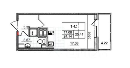 Общая площадь составляет 24.9 кв. м, высота потолков — 2.7 метра.
