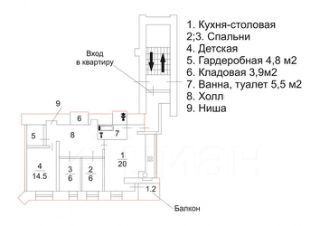 * Всего помещений: кухня-гостиная, 3 спальных комнаты, прихожая, гардеробная, холл между спальнями, кабинет, санузел и балкон ( лоджия)