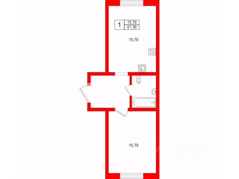 Общая площадь 41,3 кв.м., современная планировка евродвушки: большая кухня-гостиная 15,7 м2, комната 15,7 м2, просторный санузел и удобная прихожая. Пространство квартиры организовано так, что при компактной площади всё кажется удобным, продуманным.