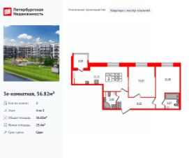 Продается уютная 2-комнатная квартира в жилом комплексе "Парадный ансамбль" в престижном Московском районе. До метро можно добраться на транспорте всего за 20 минут. Мастер-спальня с собственной ванной комнатой. Самое приватное пространство в вашей квартире. Уникальная, функциональная европланировка, большая кухня-гостиная 17.11 м², просторная прихожая 8.02 м². Общая площадь квартиры - 56.82 м², жилая 25.4 м². Квартира продается с отделкой "NORD LINE SILVER". Что особенного в ЖК "Парадный ансамбль"? • Инновационный Лицей Setl с оригинальной архитектурной концепцией и уникальной образовательной средой • Масштабное малоэтажное строительство в престижном Московском районе • Рекреационные зоны: парадный парк в центре квартала, ручей с собственной набережной, центральная площадь, ресторанный комплекс и пешеходный бульвар • Фасады из керамогранита и кирпича с яркими и акцентными входными группами • Две самые большие площадки Setl Kids и Setl Sport • Уникальные квартиры.High Flat на последних этажах, палисадники у квартир на первом этаже, семейные секции, квартиры с саунами и окном в ванной