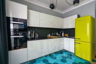 Кухня премиум-класса, совмещена с гостиной. Оборудована встроенной техникой: варочная панель, духовой шкаф, ПММ от Miele, холодильник Smeg. Окна выходят во внутренний двор, есть выход на закрытый балкон с теплым полом. Гостиная обустроена дорогой итальянской мебелью, которая специально подбиралась в Италии. Телевизор Sony с диагональю 75".