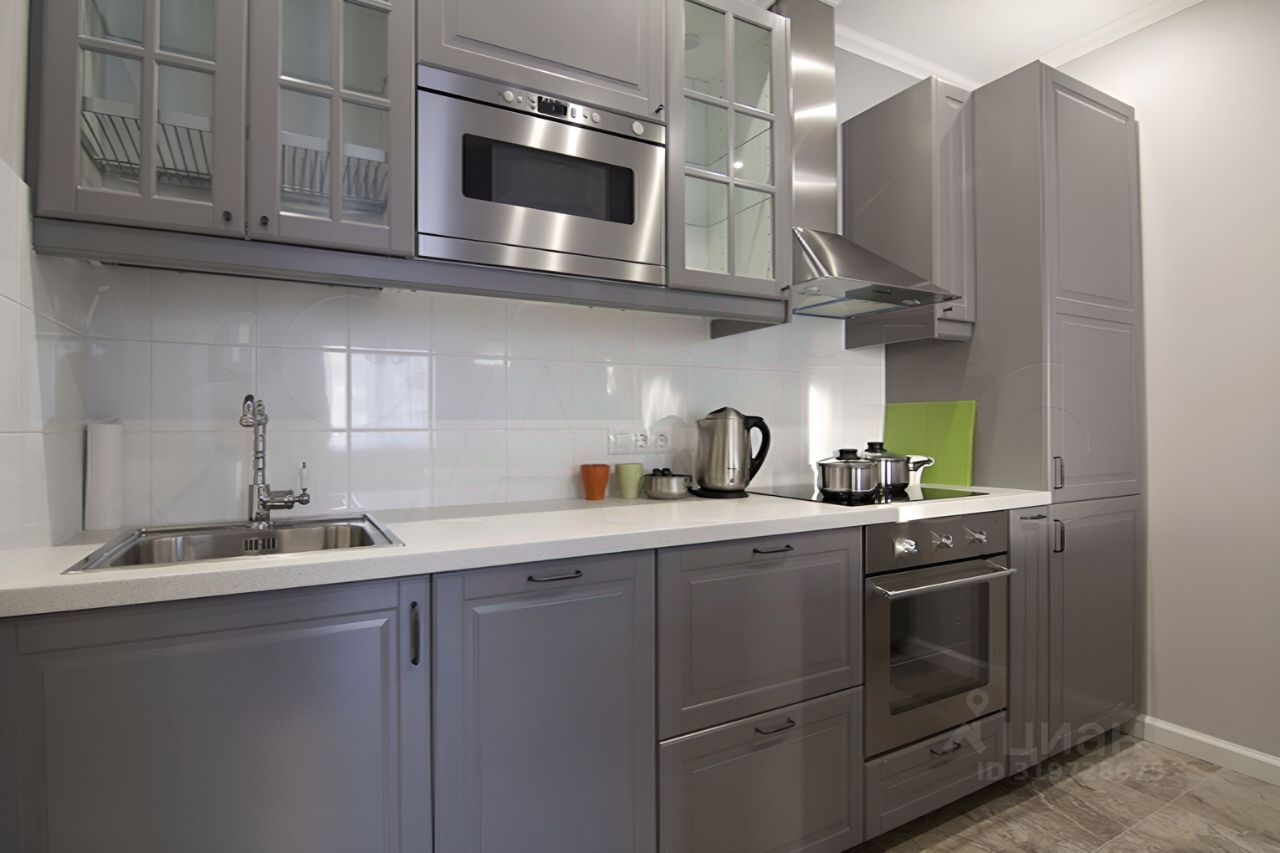 • Кухня-столовая в сдержанном сером тоне, с фартуком из плитки и встроенной техникой