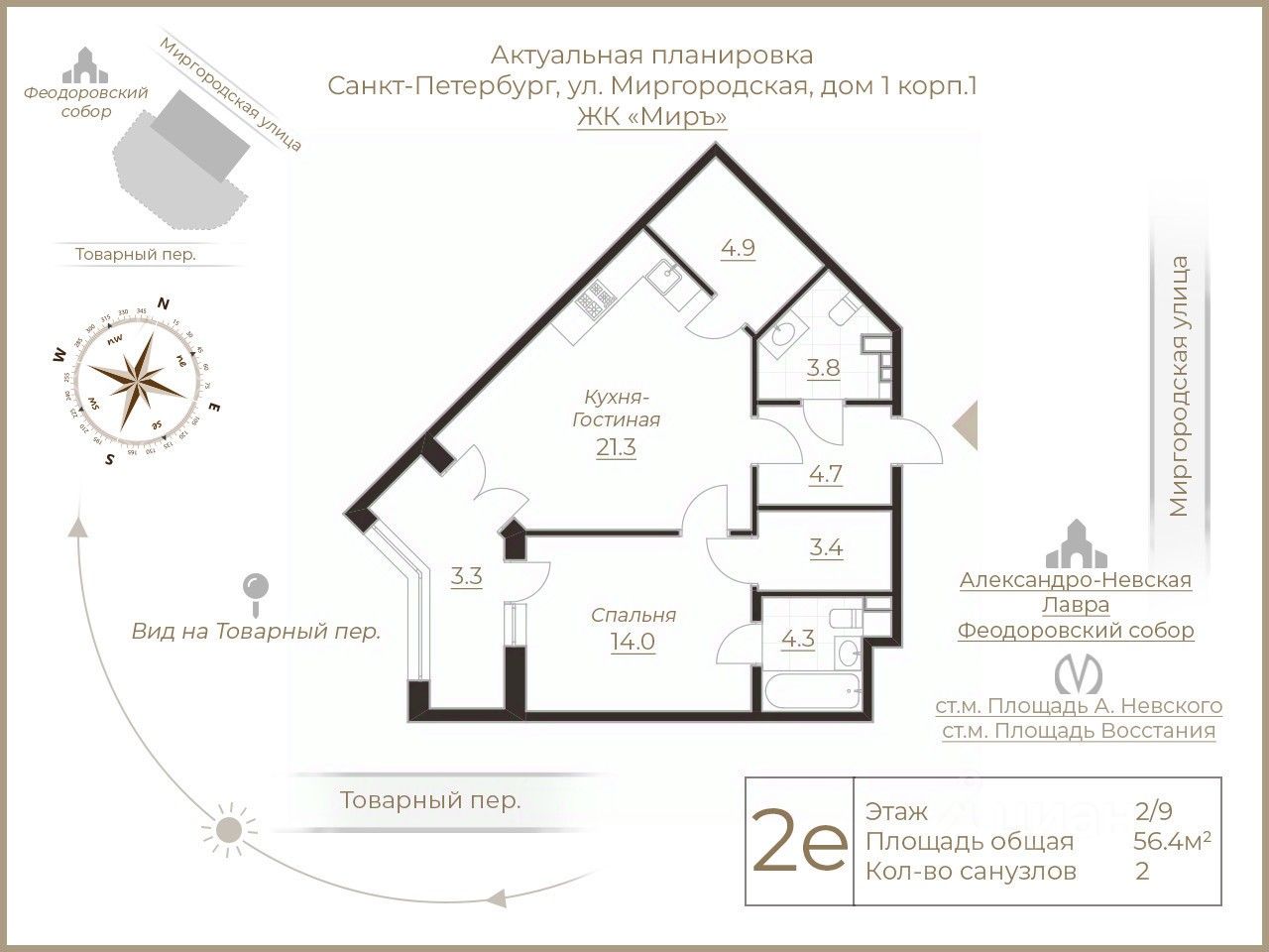 Предлагаемая квартира расположена на втором этаже, её общая площадь составляет 56,4 м². Просторная кухня-гостиная занимает 21,3 м², ещё 14 м² отведено для мастер-спальни. Уникальная особенность: в квартире сразу две гардеробные. С застеклённой лоджии открывается шикарный вид на Товарный переулок в сторону Царской столицы.