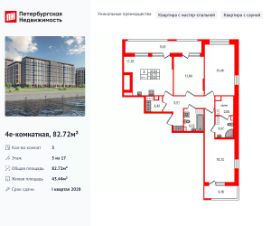 Уникальная, функциональная европланировка, большая кухня-гостиная 17.25 м², вместительная прихожая 9.01 м². Общая площадь квартиры - 82.72 м², жилая 43.44 м², высота потолка 2.77 м.