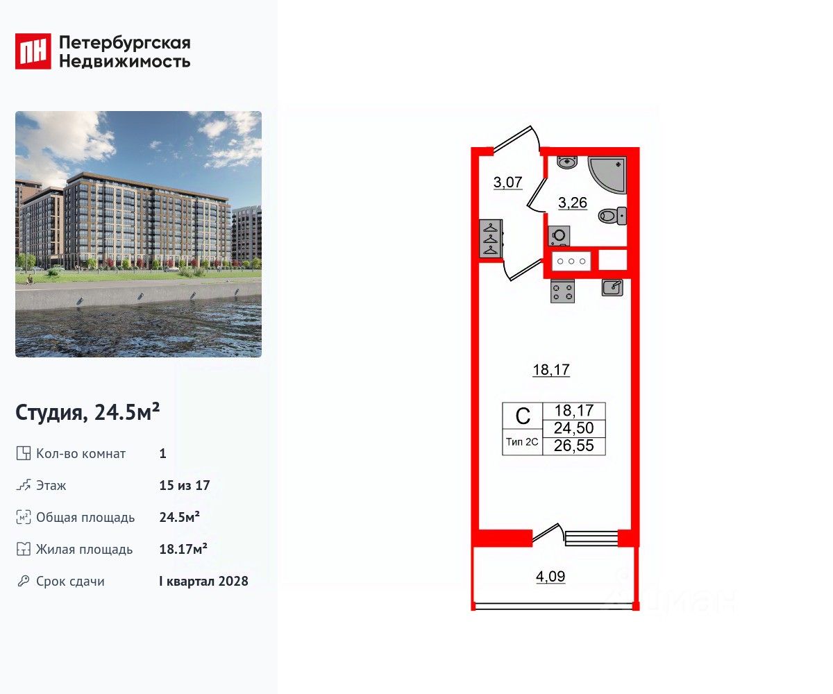 Удобная, классическая, функциональная европланировка, вместительная прихожая 3.07 м². Общая площадь студии - 24.5 м², жилая 18.17 м², высота потолка 2.77 м.