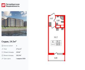 Удобная, классическая, функциональная европланировка, вместительная прихожая 3.07 м². Общая площадь студии - 24.5 м², жилая 18.17 м², высота потолка 3.04 м.