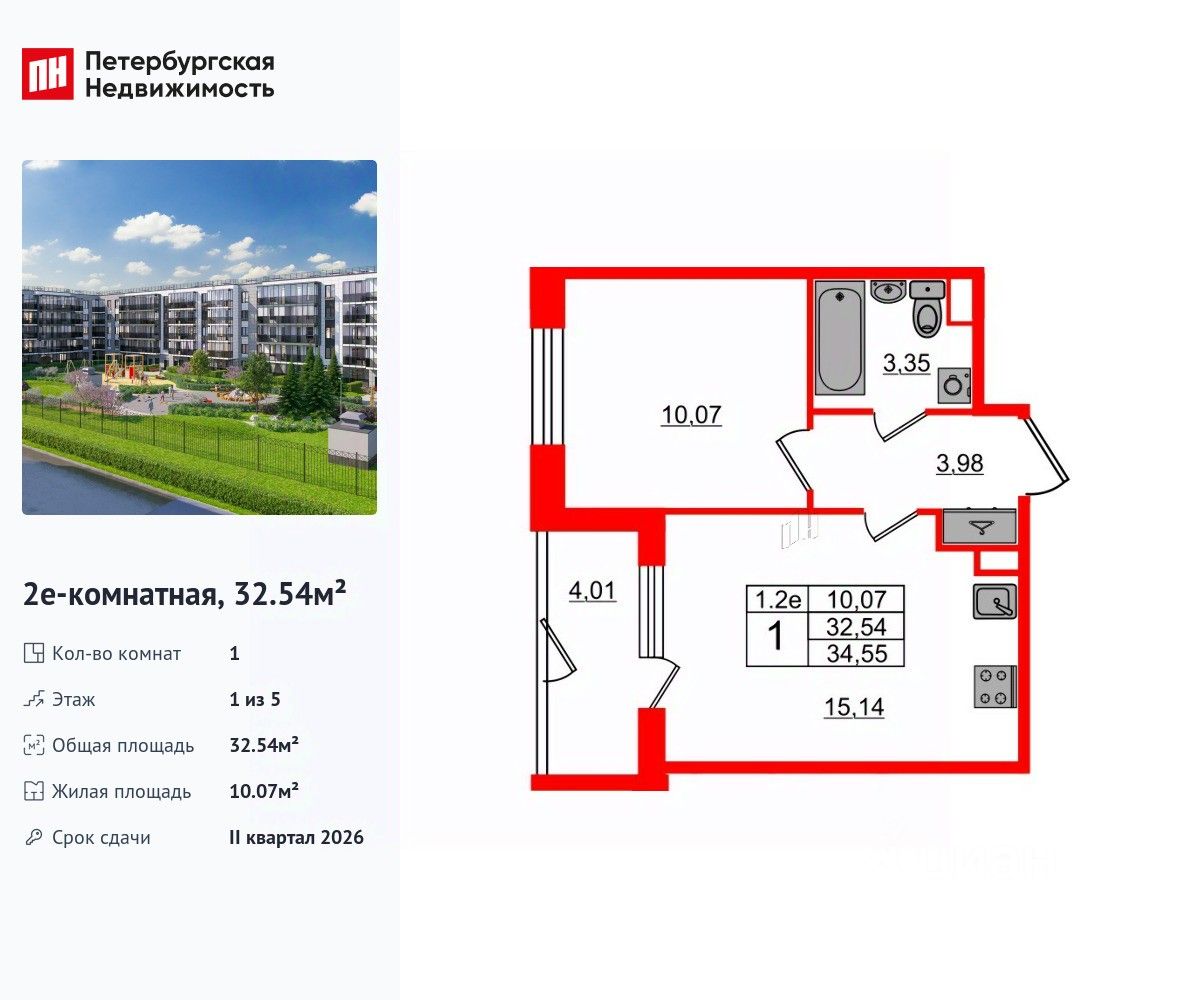 Удобная, классическая, функциональная европланировка, большая кухня-гостиная 15.14 м², вместительная прихожая 3.98 м². Общая площадь квартиры - 32.54 м², жилая 10.07 м², высота потолка 2.77 м.