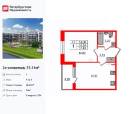 Удобная, классическая, функциональная европланировка, большая кухня-гостиная 14.61 м², вместительная прихожая 3.73 м². Общая площадь квартиры - 35.54 м², жилая 14 м², высота потолка 2.77 м.