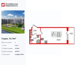 Удобная, классическая, функциональная европланировка, вместительная прихожая 3 м². Общая площадь студии - 24.24 м², жилая 18.07 м², высота потолка 3.07 м.