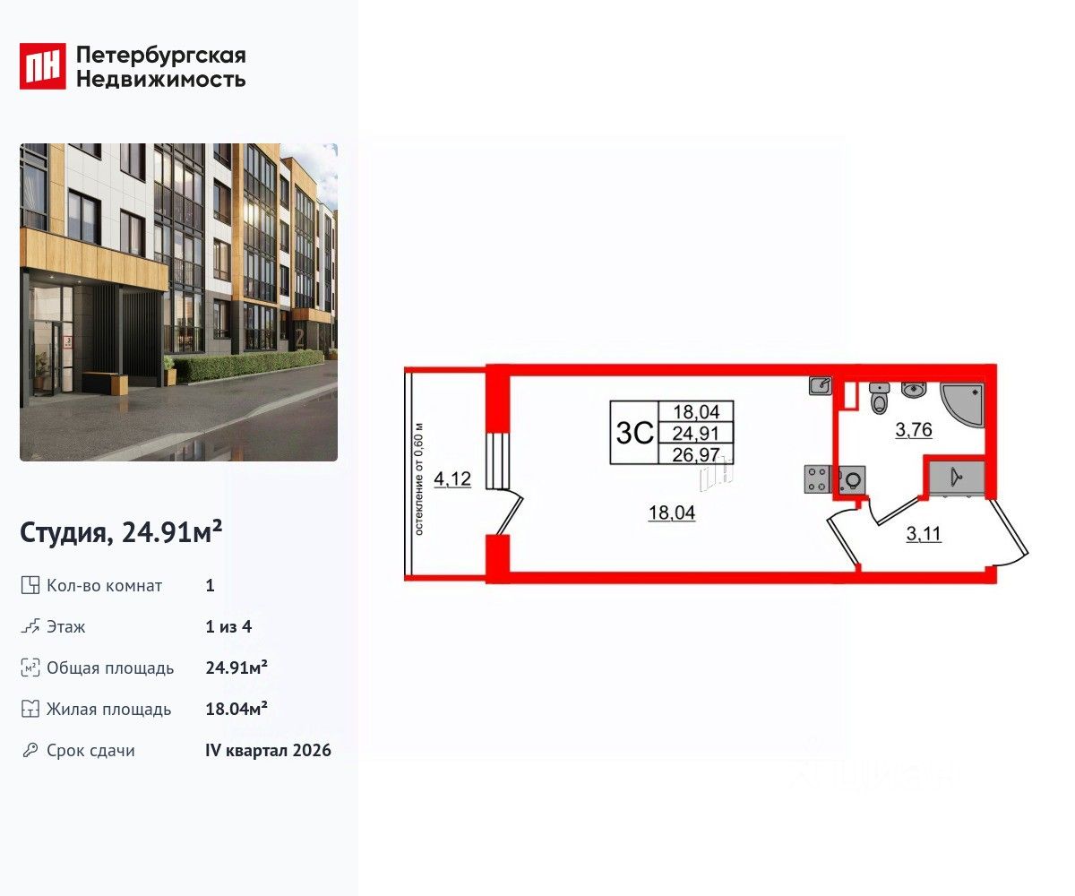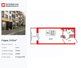 Удобная, классическая, функциональная европланировка, вместительная прихожая 3.11 м². Общая площадь студии - 24.91 м², жилая 18.04 м², высота потолка 2.77 м.