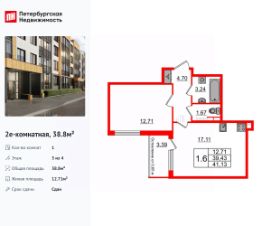 Удобная, классическая, функциональная европланировка, большая кухня-гостиная 17.11 м², просторная прихожая 4.7 м². Общая площадь квартиры - 38.8 м², жилая 12.71 м², высота потолка 2.77 м.