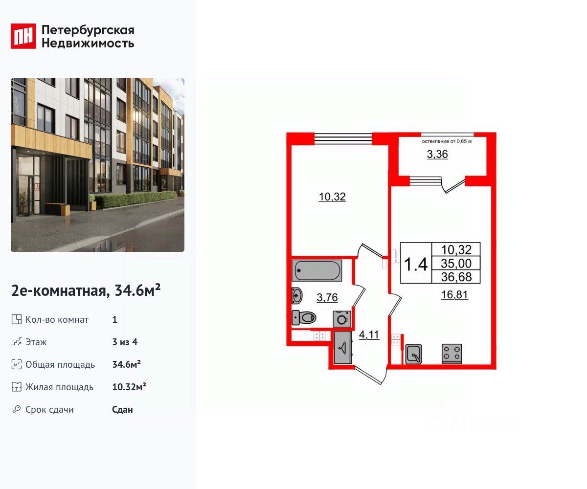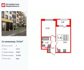 Удобная, классическая, функциональная европланировка, большая кухня-гостиная 16.81 м², вместительная прихожая 4.11 м². Общая площадь квартиры - 34.6 м², жилая 10.32 м², высота потолка 2.77 м.