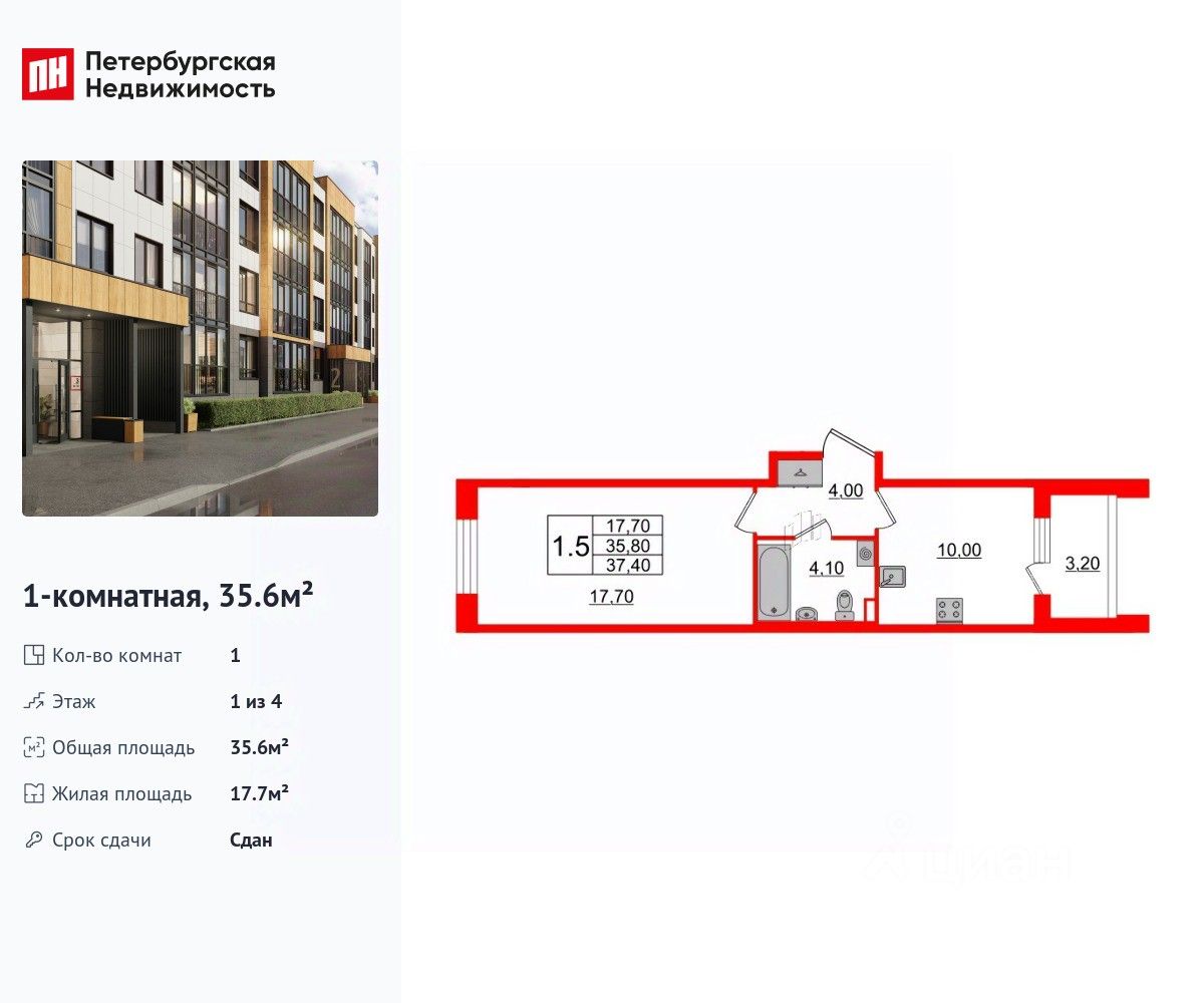 Удобная, классическая планировка, кухня 10 м², вместительная прихожая 4 м². Общая площадь квартиры - 35.6 м², жилая 17.7 м², высота потолка 2.76 м.