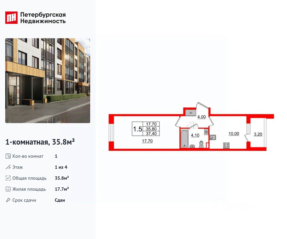 Удобная, классическая планировка, кухня 10 м², вместительная прихожая 4 м². Общая площадь квартиры - 35.8 м², жилая 17.7 м², высота потолка 2.76 м.