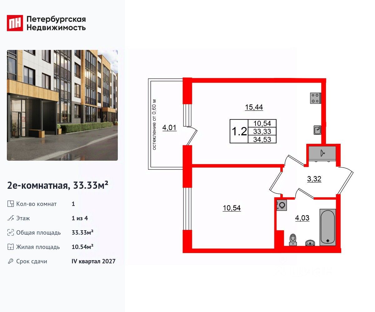 Удобная, классическая, функциональная европланировка, большая кухня-гостиная 15.44 м², вместительная прихожая 3.32 м². Общая площадь квартиры - 33.33 м², жилая 10.54 м², высота потолка 2.77 м.