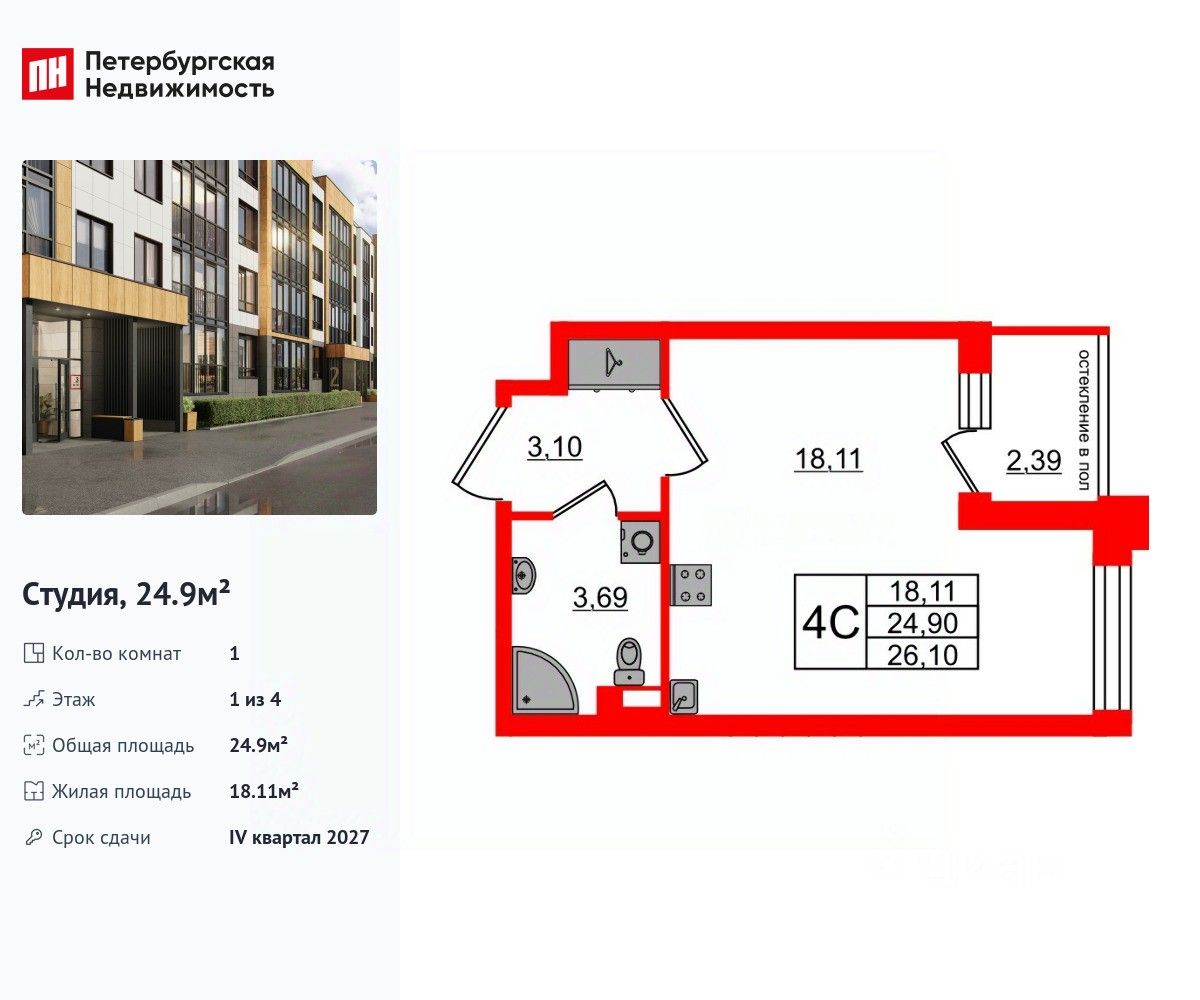 Удобная, классическая, функциональная европланировка, вместительная прихожая 3.1 м². Общая площадь студии - 24.9 м², жилая 18.11 м², высота потолка 2.77 м.