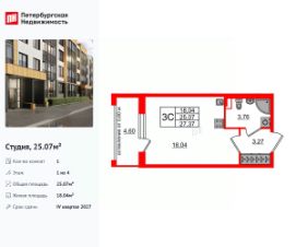 Удобная, классическая, функциональная европланировка, просторная прихожая 3.27 м². Общая площадь студии - 25.07 м², жилая 18.04 м², высота потолка 2.77 м.