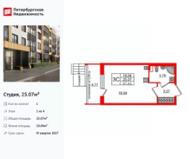 Удобная, классическая, функциональная европланировка, просторная прихожая 3.27 м². Общая площадь студии - 25.07 м², жилая  18.04 м², высота потолка 2.77 м.