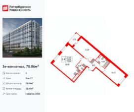 Удобная, классическая, функциональная европланировка, большая кухня-гостиная 30.95 м², просторная прихожая 8.87 м². Общая площадь квартиры - 78.06 м², жилая 31.43 м², высота потолка 2.77 м.