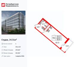 Удобная, классическая, функциональная европланировка, вместительная прихожая 3.07 м². Общая площадь студии - 24.31 м², жилая 18.13 м², высота потолка 3.11 м.