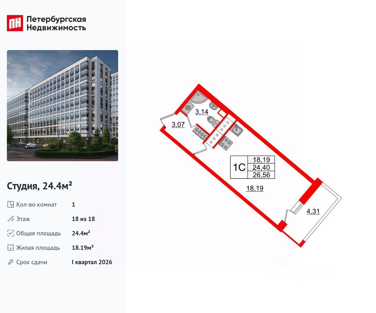 Удобная, классическая, функциональная европланировка, вместительная прихожая 3.07 м². Общая площадь студии - 24.4 м², жилая 18.19 м², высота потолка 3.11 м.