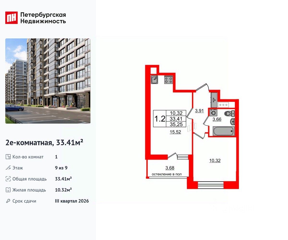 Удобная, классическая, функциональная европланировка, большая кухня-гостиная 15.52 м², вместительная прихожая 3.91 м². Общая площадь квартиры - 33.41 м², жилая 10.32 м², высота потолка 3 м.