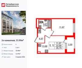 Удобная, классическая, функциональная европланировка, большая кухня-гостиная 13.68 м², просторная прихожая 4.97 м². Общая площадь квартиры - 33.99 м², жилая 11.97 м², высота потолка 2.75 м.
