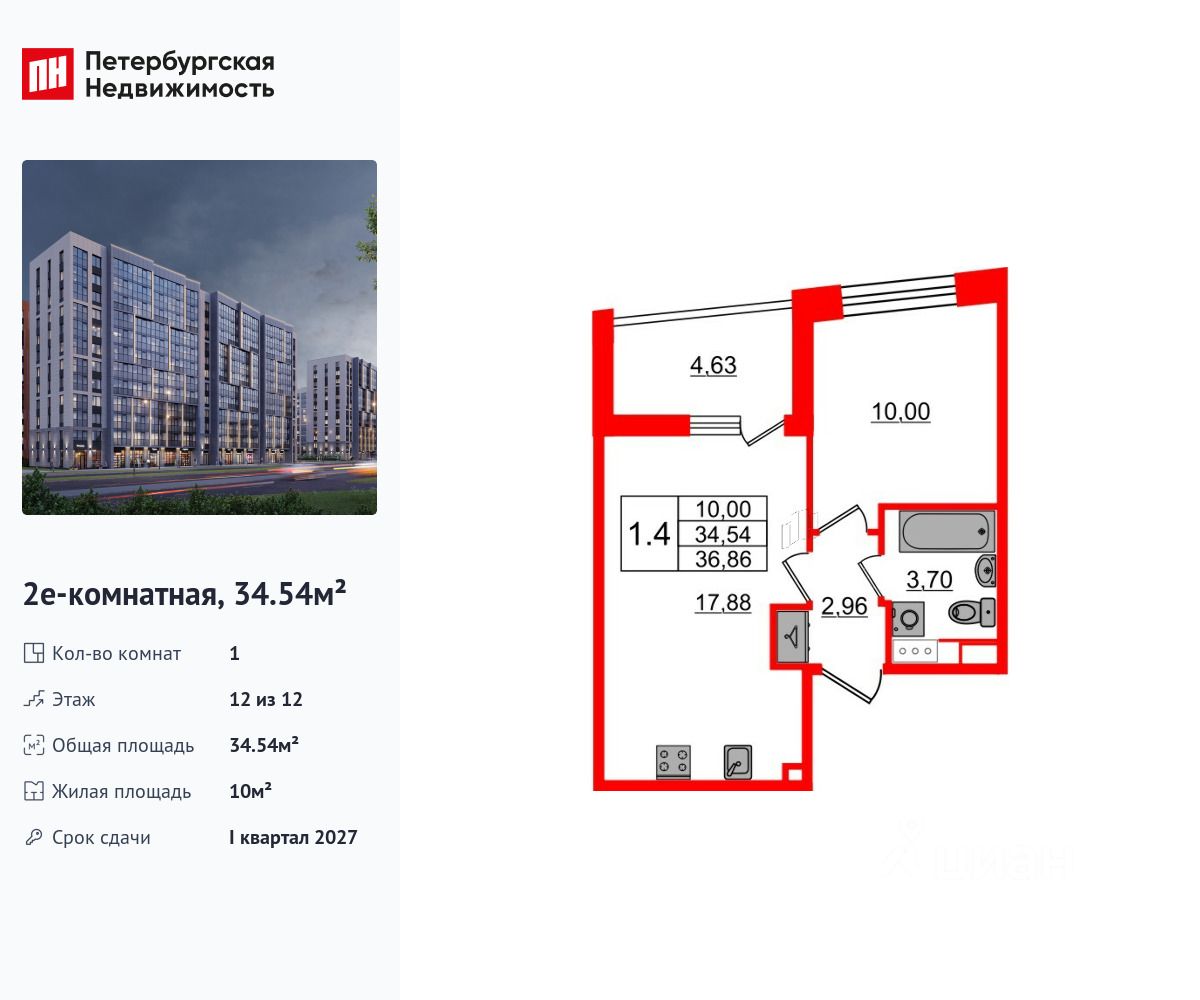 Удобная, классическая, функциональная европланировка, большая кухня-гостиная 17.88 м², вместительная прихожая 2.96 м². Общая площадь квартиры - 34.54 м², жилая 10 м², высота потолка 3 м.