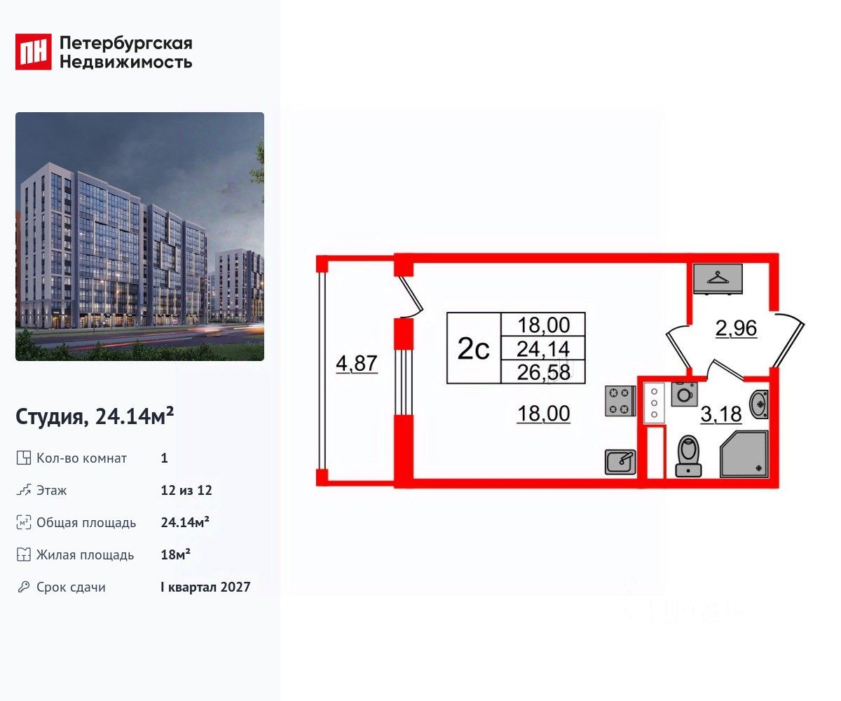Удобная, классическая, функциональная европланировка, вместительная прихожая 2.96 м². Общая площадь студии - 24.14 м², жилая 18 м², высота потолка 3 м.