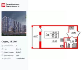Удобная, классическая, функциональная европланировка, вместительная прихожая 2.96 м². Общая площадь студии - 24.14 м², жилая 18 м², высота потолка 2.77 м.