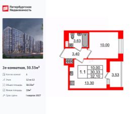 Удобная, классическая, функциональная европланировка, большая кухня-гостиная 13.3 м², вместительная прихожая 3.4 м². Общая площадь квартиры - 30.33 м², жилая 10 м², высота потолка 3 м.