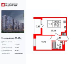 Удобная, классическая, функциональная европланировка, большая кухня-гостиная 17.44 м², вместительная прихожая 3.85 м². Общая площадь квартиры - 35.13 м², жилая 10.1 м², высота потолка 3 м.