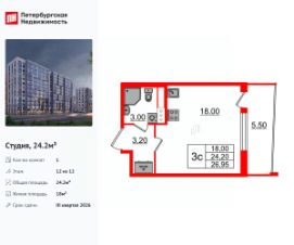 Удобная, классическая, функциональная европланировка, вместительная прихожая 3.2 м². Общая площадь студии - 24.2 м², жилая  18 м², высота потолка 3 м.