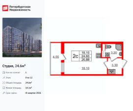 Удобная, классическая, функциональная европланировка, просторная прихожая 3.3 м². Общая площадь студии - 24.6 м², жилая 18.1 м², высота потолка 2.77 м.