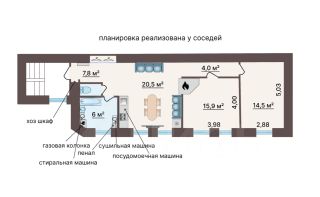 Смотрите в объявлении реализованные у соседей планировки и возможные варианты.