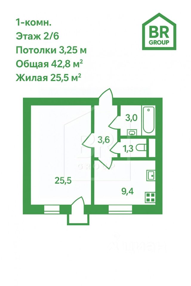 Комната 25,5 м² — легко зонируется на спальню и гостиную (можно поставить стильную лофт-перегородку).