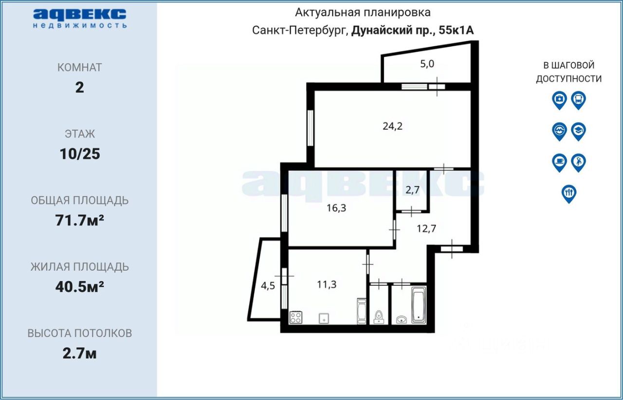 - Две полноценные изолированные комнаты 16.3 м2 (окно во двор), 25.2 м2 (окно во двор и окно на угол Дунайского пр-та и Бухарестской ул.), рядом с домом уже точно ничего не построят