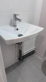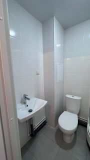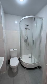 * раковина с тумбой, ( стиль скандинавский), смесители, унитаз, полотенцесушитель электрический, душевая кабина , установлены осветительные приборы, счетчики ГВС/ХВС