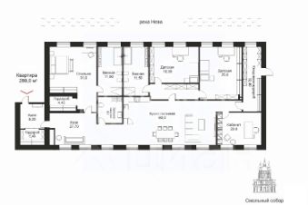 Благодаря двухсторонней планировке (по 9 окон на каждую сторону) на общей площади 289 кв. м, предполагается расположение от 3 до 5 спален, гостиного зала с кухней и обеденной зоной, три санузла (собственные для мастер-спальни и детских комнат), просторный холл-прихожая, вместительные подсобные/гардеробные помещения. Размещение на последнем этаже также открывает возможную опцию использования эксплуатируемой крыши над резиденцией в качестве открытой террасы (дополнительно около 300 кв. м). Придомовая территория комплекса находится под видеонаблюдением, профессиональная охрана. В наличии три парковочных места в подземном отапливаемом паркинге.