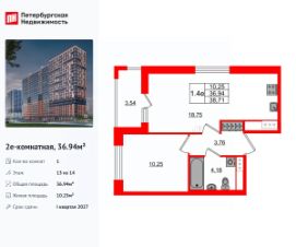 Удобная, классическая, функциональная европланировка, большая кухня-гостиная 18.75 м², вместительная прихожая 3.88 м². Общая площадь квартиры - 36.94 м², жилая 10.25 м², высота потолка 2.75 м.
