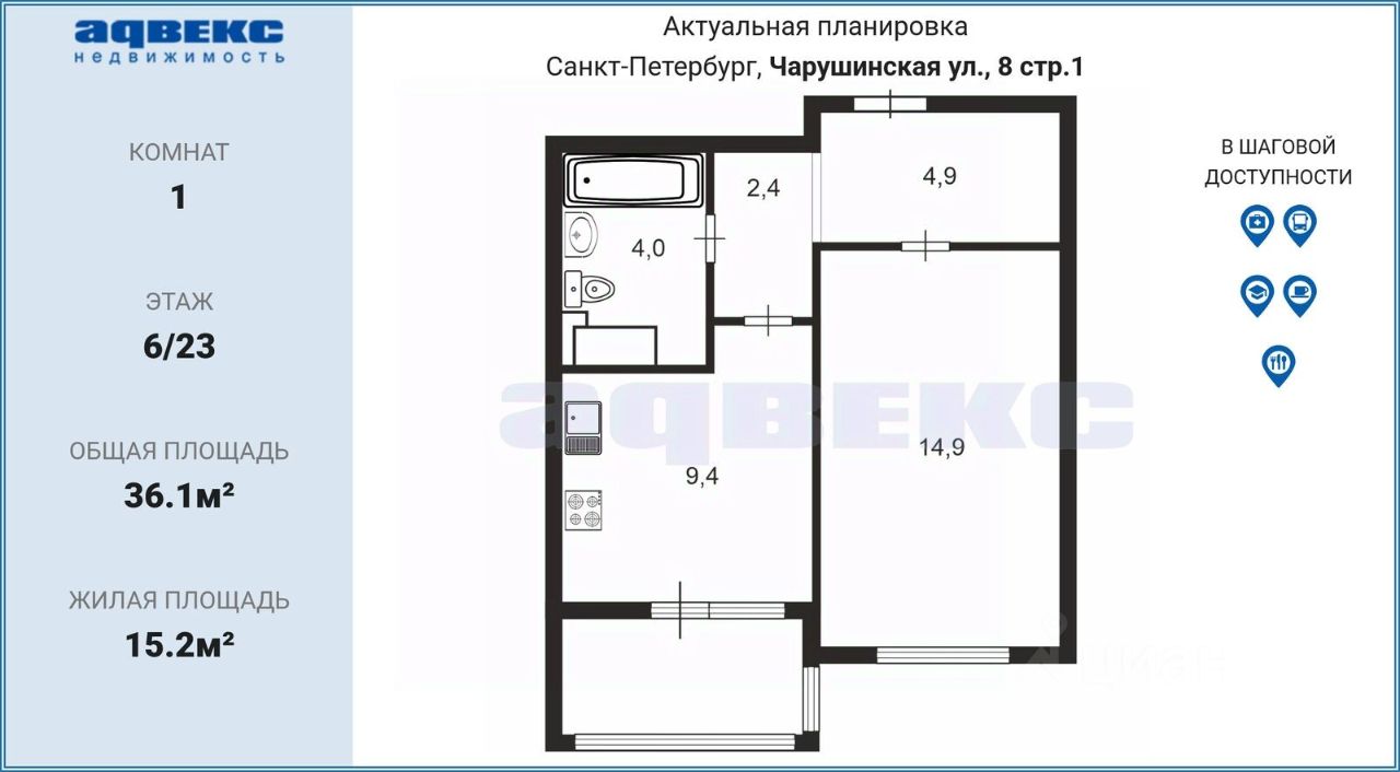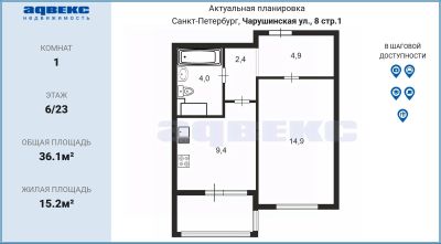 Квартира 36,1 кв.м. расположена на 6 этаже.