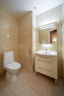 Отделка в квартире выполнена по финским стандартам, установлена финская сантехника и мебель в санузлах, теплые полы под кафельной плиткой, вместительные гардеробные и шкафы-купе в прихожей. В подарок покупателю остается кухонная мебель Икеа, варочная панель и духовой шкаф фирмы Bosch, холодильник и морозильный шкаф фирмы Liebherr, посудомоечная и стиральные машины.